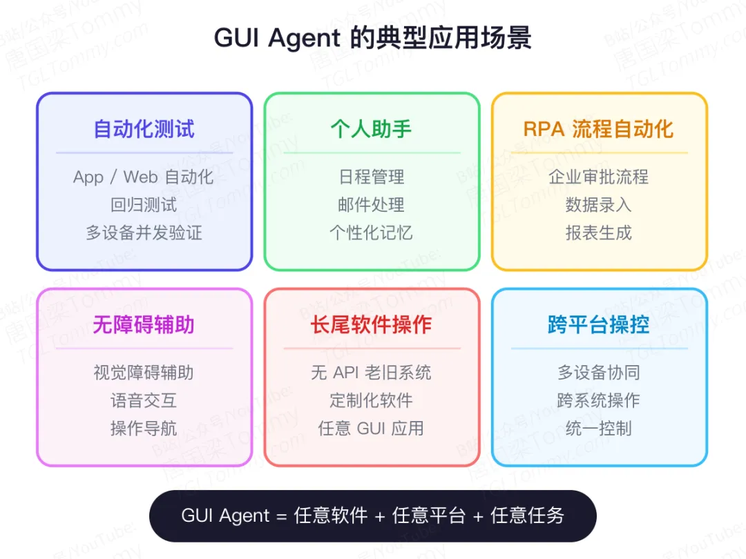 它叫 GUI Agent——通过视觉界面而非API来操控软件的智能体。它能点击、滑动、输入文字,覆盖从微信到银行App,从企业内部系统到各类长尾软件。