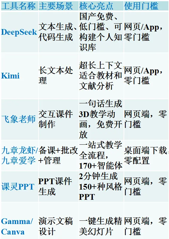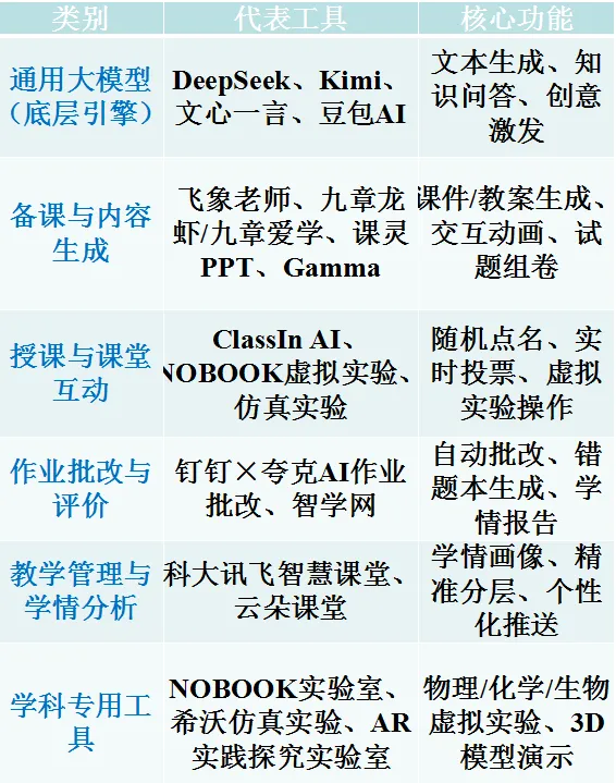 在介绍具体工具之前,先建立一个整体框架。教师常用AI工具大致可分为以下六类: