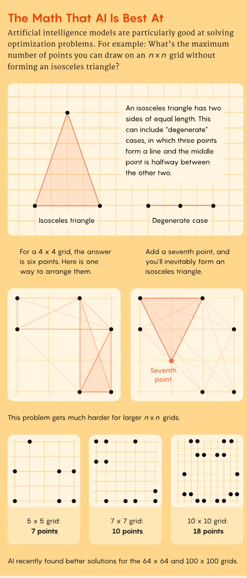 但在那些早期,这还是一个 niche 领域。起初,Charton和其他少数人使用人工智能来解决已知答案的问题,只是为了看看新技术是否有效。到2024年,他们开始取得进展。他们寻找那些有丰富数据可供分析的问题,然后利用人工智能构建具有可量化性质的数学对象——比如在网格上放置点而不形成等腰三角形的最优排列。