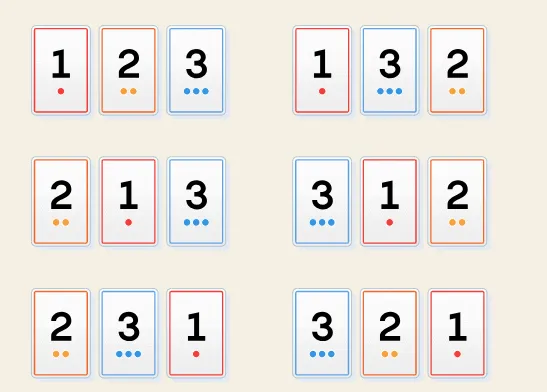 开始时很简单。如果你只有一张牌,你无法洗牌。所以置换群S₁只有一个元素。S₂有两个元素:如果你有两张牌,它们可以以两种顺序出现。S₃变得稍微复杂一些;有三张牌的一副牌有六种不同的排列方式。
