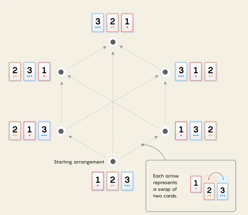 不同的排列方式可以排列成一个由顶点和边组成的网络,称为图。起始排列123放在底部。图中的每条边(画成箭头)代表交换两张牌: