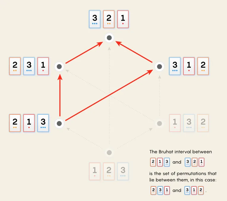 再次考虑置换群S₃的图,它有六个元素,即六种排列。我们想要探究这些排列之间的关系。一种方法是考察通过沿箭头移动从一种排列到达另一种排列的所有方式。如果可以从第一种排列沿箭头到达第二种排列,那么该排列"小于"另一种排列(使用称为Bruhat序的大小定义)。所以213小于321。