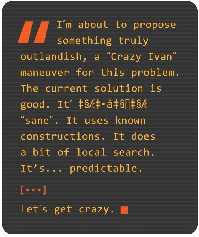 LLM在进行计算时自言自语。"我要提出一个真正古怪的想法,一个解决这个问题的'疯狂伊万'策略,"它沉思道,这指的是潜艇有时用来探测敌方的一种急转弯,因汤姆·克兰西的小说《猎杀红色十月》而广为人知。