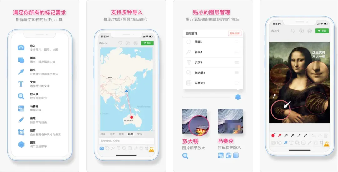 一款简洁好用的图像标记应用,支持从相册、地图导入图片,并且支持多种工具标记:放大镜,马赛克,钢笔等等!