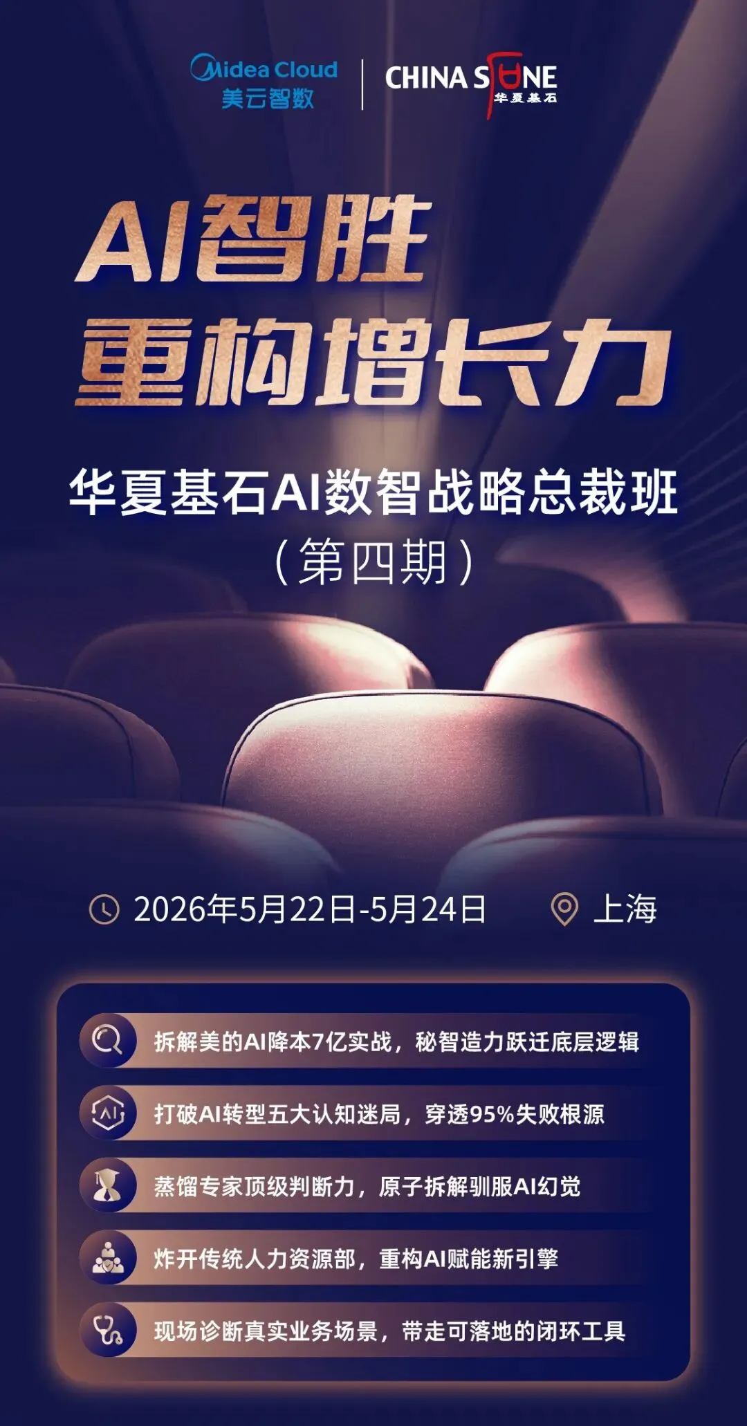 2026年5月22日-24日,华夏基石AI战略总裁班第四期,首次同时拆解两套成功范式:美的集团的AI智造力跃迁 + 华夏基石的“专家×AI×组织进化”落地体系。