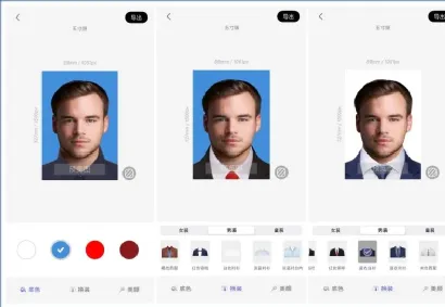它支持相册导入,也支持直接拍摄,支持AI抠图秒换底色,支持任意切换多种标准底色;它支持海量正装模板,包括16个男装模板、12个女装模板,可以选择一个正装模板,移动位置,调整大小。