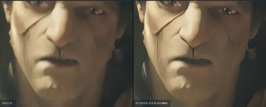 明显能看到原视频模糊噪点块大部分都去除了,并且人物毛发和服饰细节非常的还原。