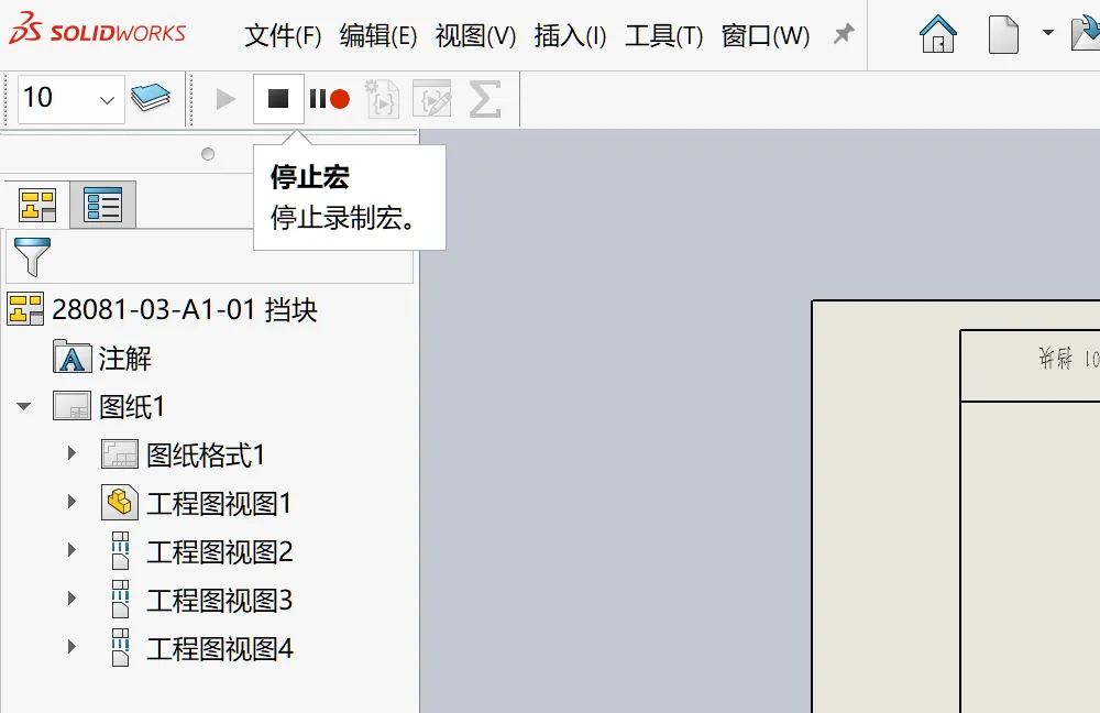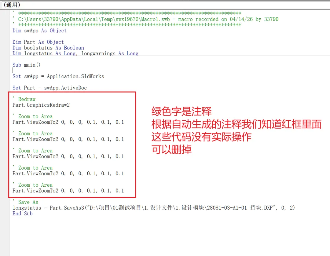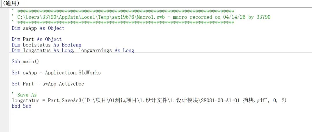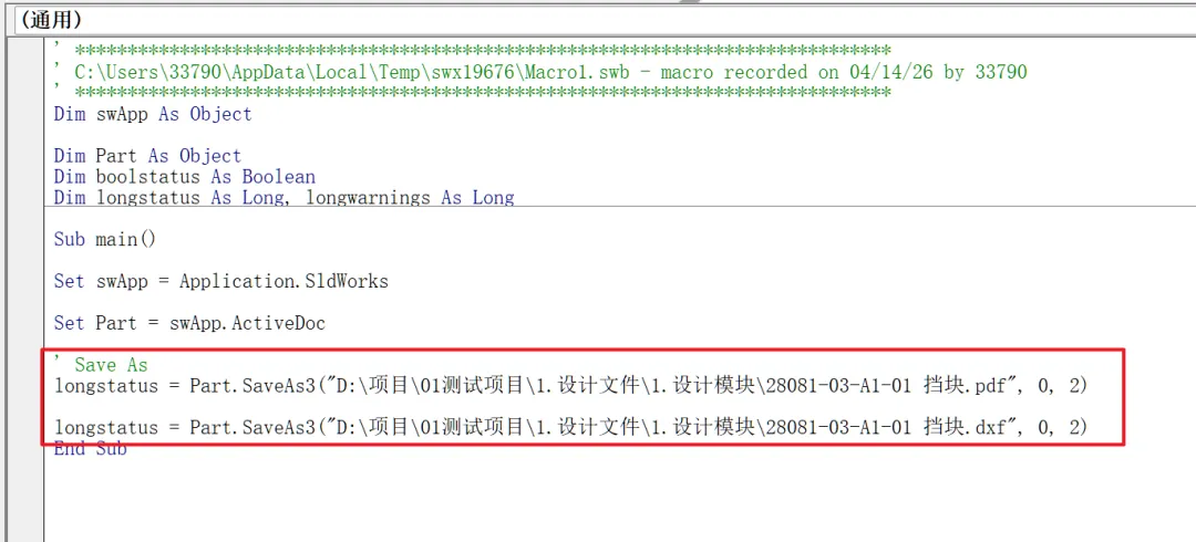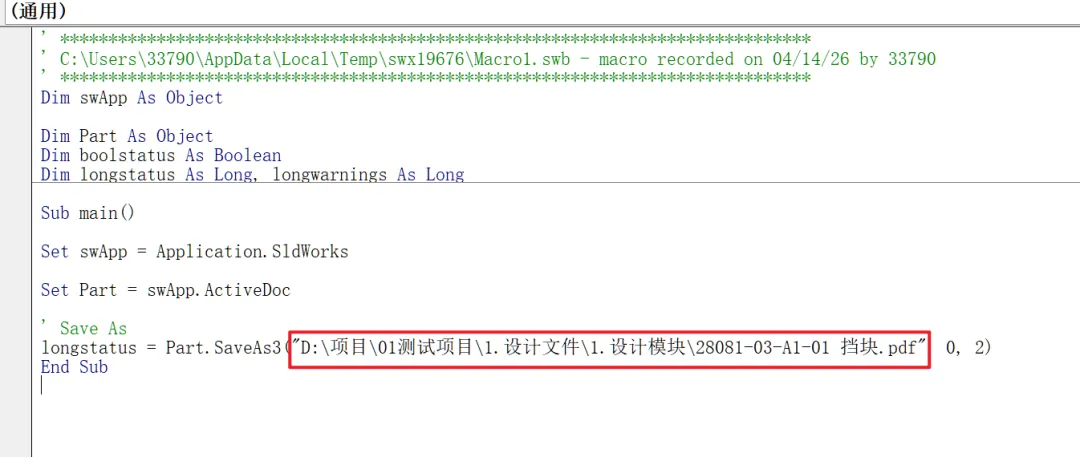 但是现在有一个问题,路径是固定的,用于其他工程图的时候,执行这个宏时还是会按照这个路径来另存。那绝对不是我们想要的对吧?所以我们需要把这个路径字符串改为一个变量。