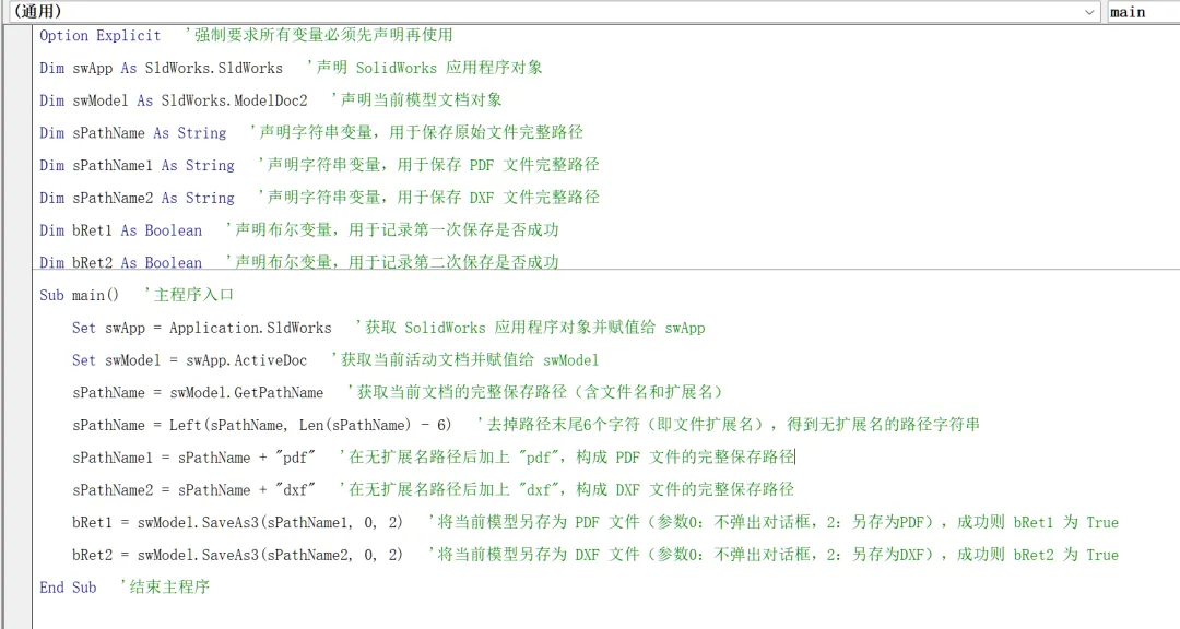 Option Explicit Dim swApp As SldWorks.SldWorks Dim swModel As SldWorks.ModelDoc2 Dim sPathName As String Dim sPathName1 As String Dim sPathName2 As String Dim bRet1 As Boolean Dim bRet2 As BooleanSub main() Set swApp = Application.SldWorks Set swModel = swApp.ActiveDoc sPathName = swModel.GetPathName sPathName = Left(sPathName, Len(sPathName) - 6) sPathName1 = sPathName + "pdf" sPathName2 = sPathName + "dxf" bRet1 = swModel.SaveAs3(sPathName1, 0, 2) bRet2 = swModel.SaveAs3(sPathName2, 0, 2)End Sub