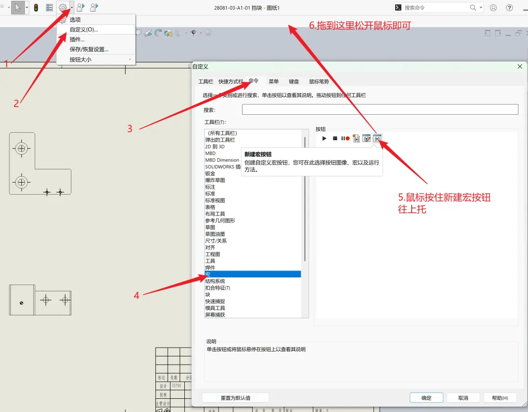 按住宏按钮往工具栏上拖。拖到工程图界面,那就是激活工程图环境的时候按钮才会出现;其他环境也是一样。拖到最上面(工具栏区域),那么任何时候都会出现。