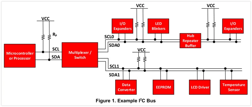 图1展示了一个典型的用于嵌入式系统中的I2C总线,其上挂载了多种从设备。作为I2C主机的从微控制器控制着IO拓展、不同传感器、EEPROM、多个ADC/多个DAC、等等。所有这些设备只需要通过来自主机的两根引脚来控制。