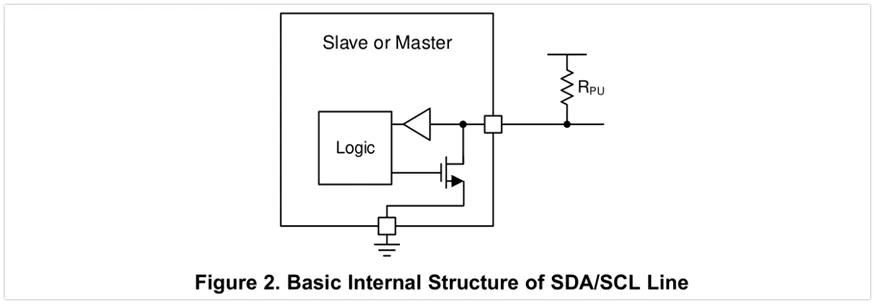 图2展示了位于SDA/SCL线上的主从设备的内部简化结构,其由一个用于读取数据的缓冲器,以及一个用于发送数据的下拉场效应管组成。一个设备只被允许拉低总线(规定为短路到地)或释放总线(对地呈现高阻态)以允许上拉电阻拉升总线电平。当处理I2C设备时,有一个重要的概念需要阐明:没有设备可以保持总线为高。这个特性使得双向通讯得以实现。