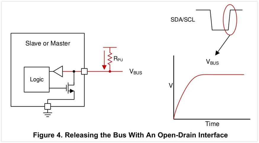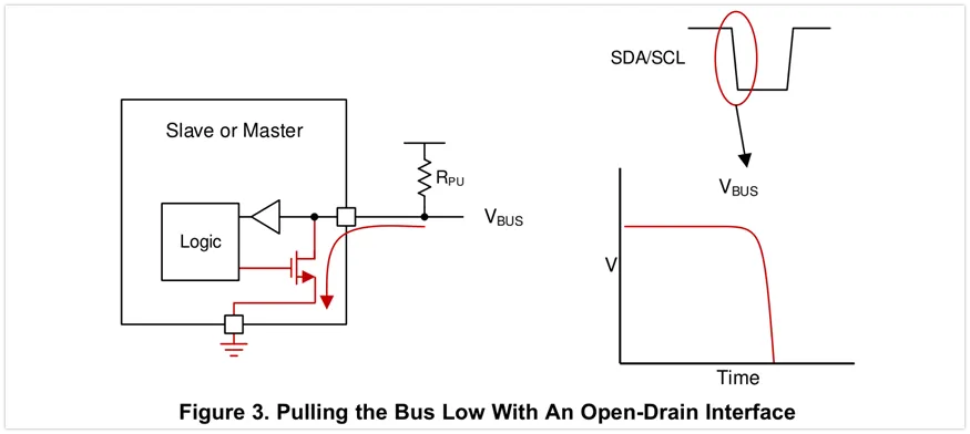 开漏输出极允许将总线上的电压拉低(大多数情况下是到地),或释放总线以允许其被上拉电阻拉高。当总线被主机或从机释放,线上的上拉电阻负责将线上电压上拉到电源轨。由于并没有设备可以在总线上输出高电平,这也就意味着总线在通讯中,将不会碰到一个设备输出高,而另一个设备试图输出低所导致的短路问题(电源轨到地)。I2C总线要求处于多主机环境下的单个主机在输出高而读回的实际总线电平为低时(这意味着另一个设备拉低了它)中止通讯,因为另一个设备正在使用总线。采用推挽输出方式的接口就没有这么自由了,这也正是I2C总线的一个优势。