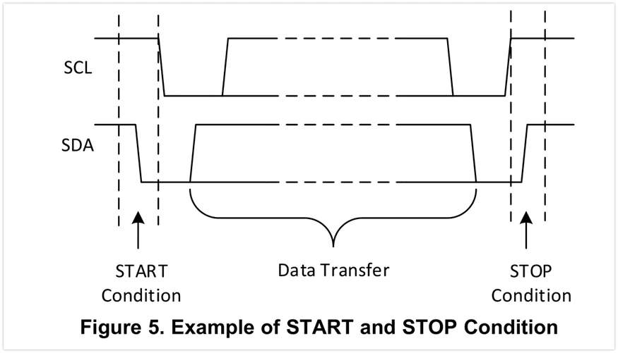 主机可以通过发送START标志初始化与设备的I2C通讯,或者发送STOP标志结束通讯。当SCL处于高电平时,SDA上的下降沿意味着一个START标志,而SDA上的上升沿意味着一个STOP标志。