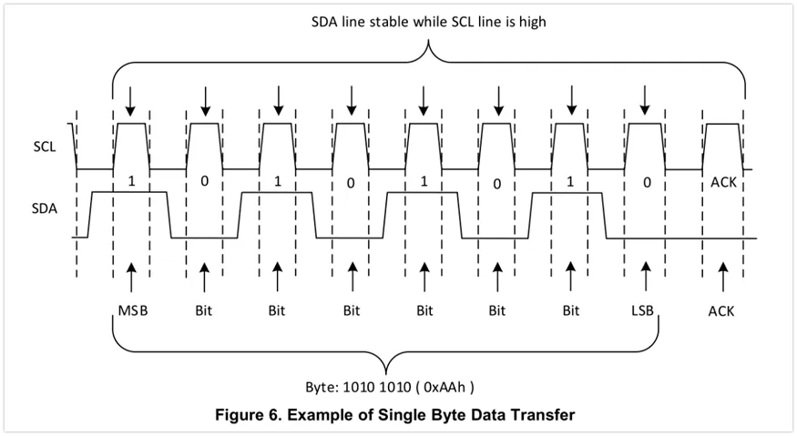 数据位伴随着SCL上的每一个时钟脉冲被传输。单个字节由SDA线上的8位数据组成,其可以是设备地址、寄存器地址或者读自/写入设备的数据。数据以大端在前(MSB)的方式传输。在START标志与STOP标志之间可以传输任意数量的数据字节。SDA线上的数据必须在时钟电平为高时保持稳定,因为SCL线为高时,SDA线上的变动将会被当作控制指令(START或STOP)。