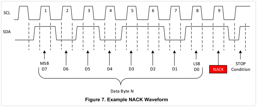 如果SDA线在ACK/NACK时钟周期保持为高电平,这将会被作为NACK。有好几种状态将会导致NACK的产生: