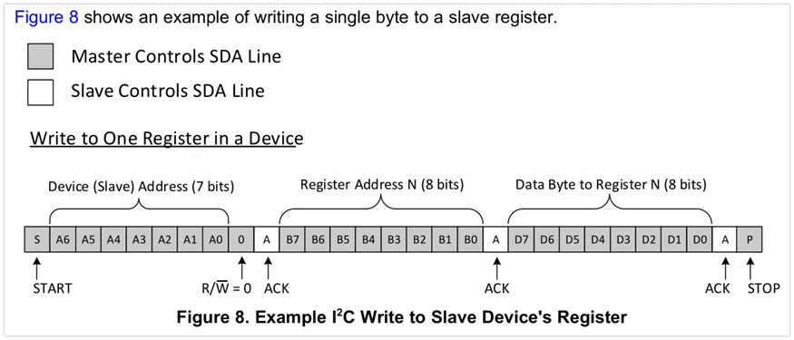 图8展示了一个写入单个字节到从机寄存器的例子。