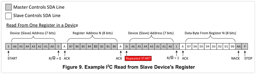 为了读取从机,主机必须先指示从机自己想要读取哪个寄存器。这一步通过执行与写操作类似的开始通讯步骤完成,发送读写位为0的设备地址(意味着一次写操作),紧跟着希望读的寄存器的地址。一旦从机应答了此地址,主机将会再一次发送START标志,并发送读写位为1的设备地址(意味着一次读操作)。这时,从机将会应答读请求,同时主机释放总线但是保持到从机的时钟供应。在通讯流程的这一部分,主机将会作为接收方主机,同时从机将会作为发送方从机。