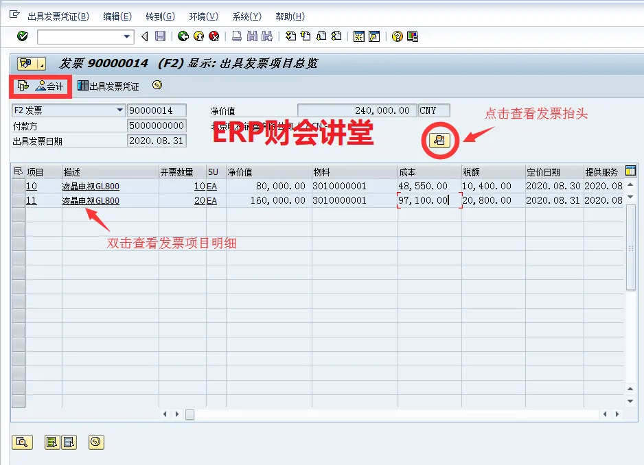 查看发票明细,选择“出具发票项”,或回车即可(下图)。在总览界面,也可查看发票的凭证流、会计凭证(上图红框)。发票总览主要显示发票的净值,开票的物料、数量、以及金额等信息。点击上图红圈中的图标可以查看发票抬头详细信息。