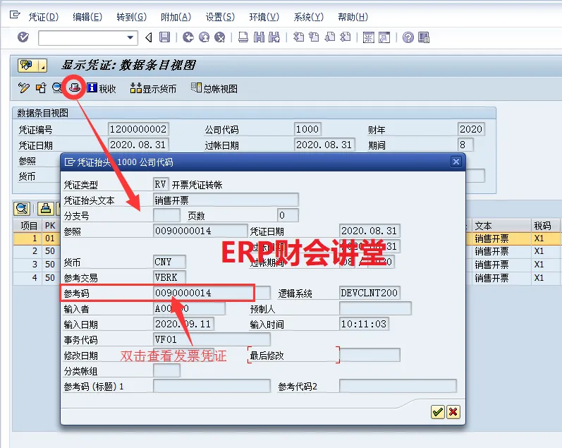 有时候,财务人员可能知道会计凭证,想要查看对应的发票凭证,操作方法如下,点击抬头,在参考码中显示的内容即为对应的发票凭证号。