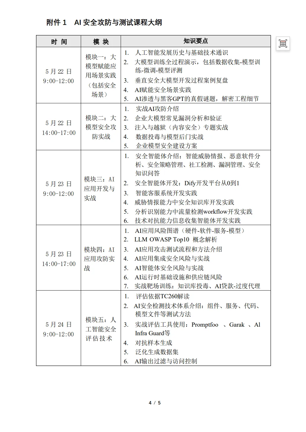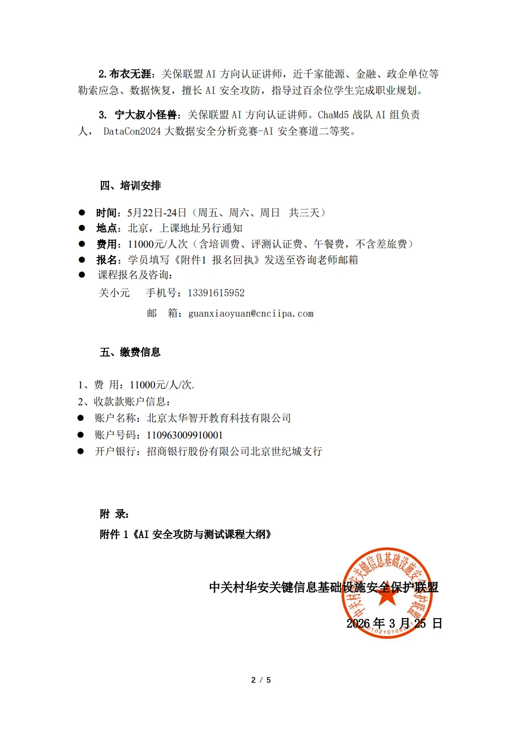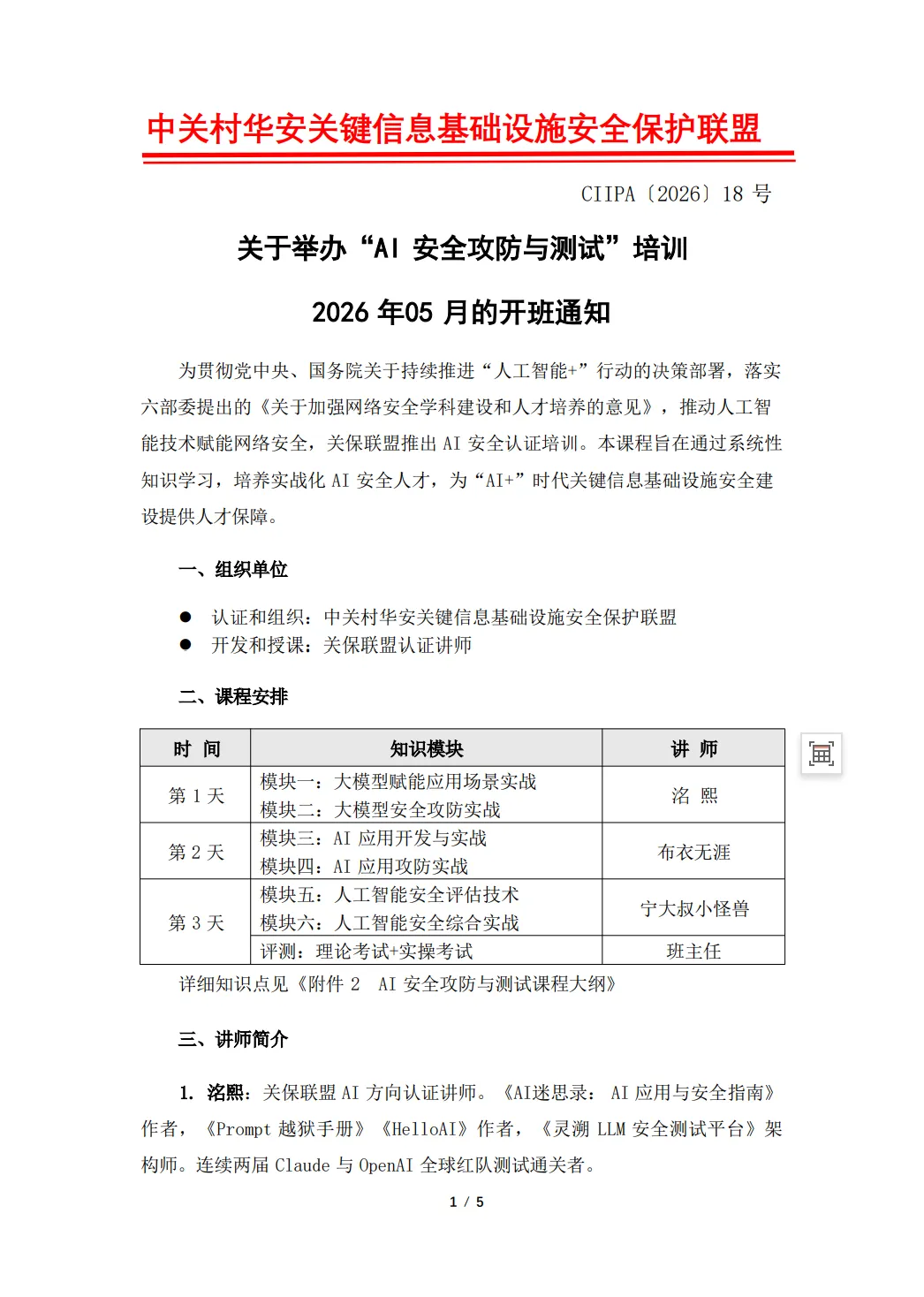 关于举办“AI 安全攻防与测试”培训 2026 年5 月的开班通知