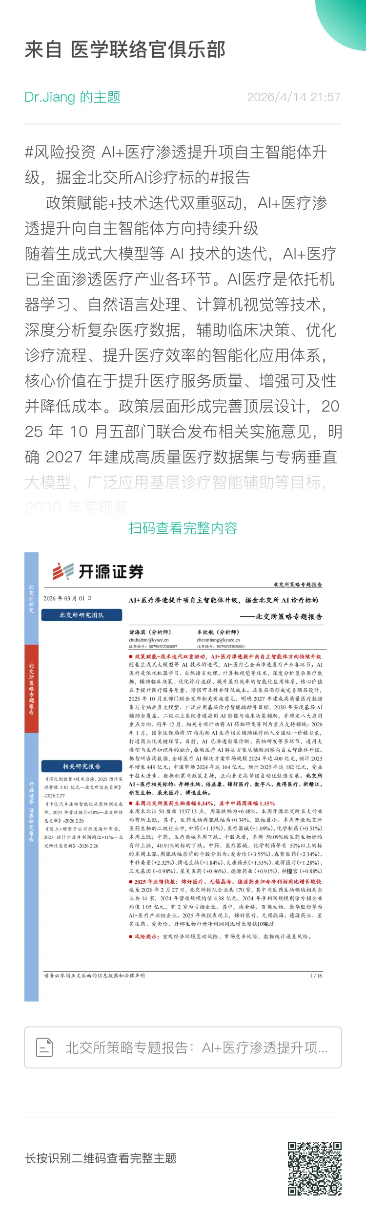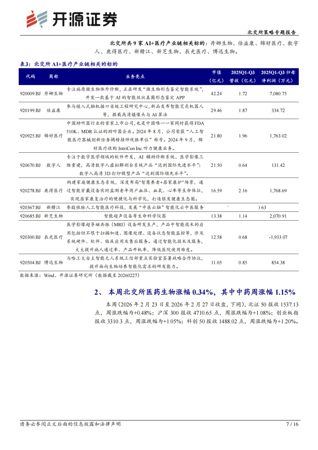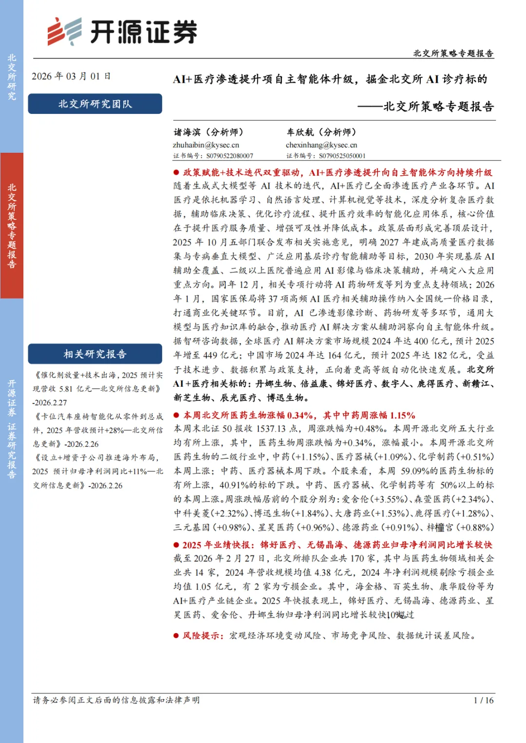 随着生成式大模型等 AI 技术的迭代,AI+医疗已全面渗透医疗产业各环节。AI医疗是依托机器学习、自然语言处理、计算机视觉等技术,深度分析复杂医疗数据,辅助临床决策、优化诊疗流程、提升医疗效率的智能化应用体系,核心价值在于提升医疗服务质量、增强可及性并降低成本。政策层面形成完善顶层设计,2025 年 10 月五部门联合发布相关实施意见,明确 2027 年建成高质量医疗数据集与专病垂直大模型、广泛应用基层诊疗智能辅助等目标,2030 年实现基层 AI辅助全覆盖、二级以上医院普遍应用 AI 影像与临床决策辅助,并确定八大应用重点方向。同年 12 月,相关专项行动将 AI 药物研发等列为重点支持领域;2026年 1 月,国家医保局将 37 项高频 AI 医疗相关辅助操作纳入全国统一价格目录,打通商业化关键环节。目前,AI 已渗透影像诊断、药物研发等多环节,通用大模型与医疗知识库的融合,推动医疗 AI 解决方案从辅助洞察向自主智能体升级。据智研咨询数据,全球医疗 AI 解决方案市场规模 2024 年达 400 亿元,预计 2025年增至 449 亿元;中国市场 2024 年达 164 亿元,预计 2025 年达 182 亿元,受益于技术进步、数据积累与政策支持,正向着更高等级自动化快速发展。北交所AI +医疗相关标的:丹娜生物、倍益康、锦好医疗、数字人、鹿得医疗、新赣江、新芝生物、辰光医疗、博迅生物。