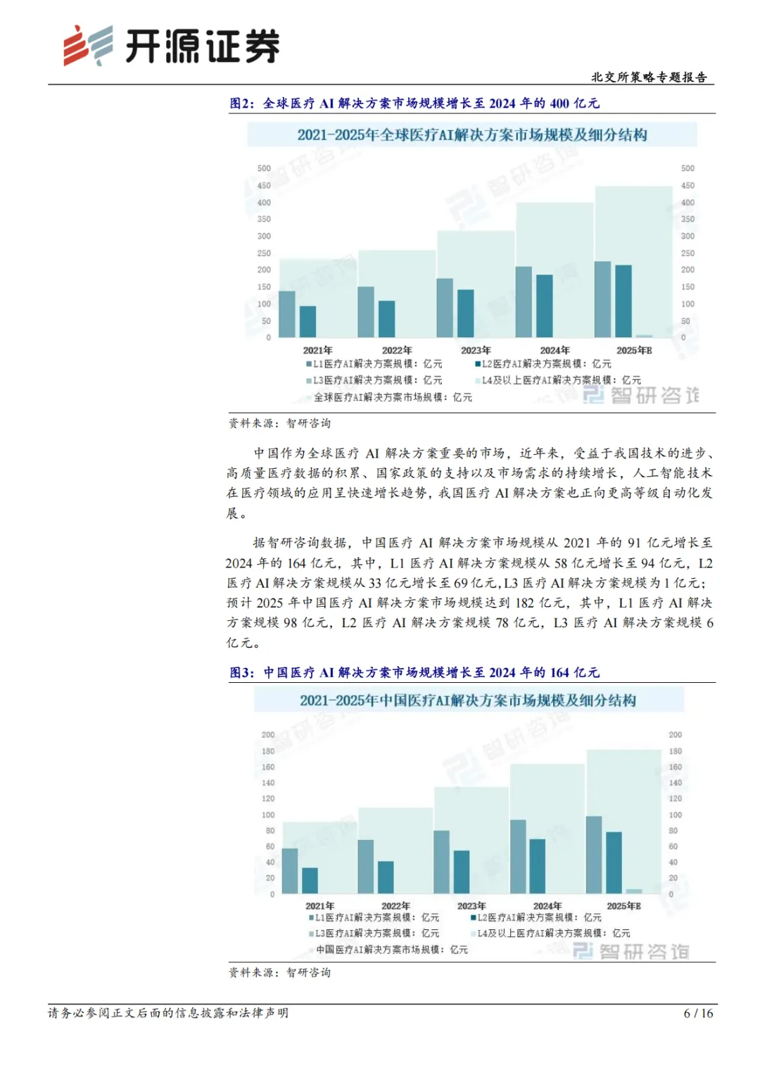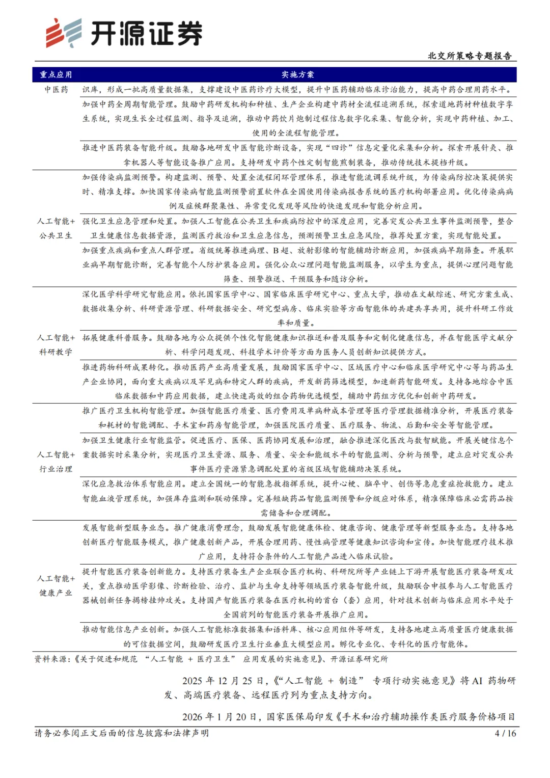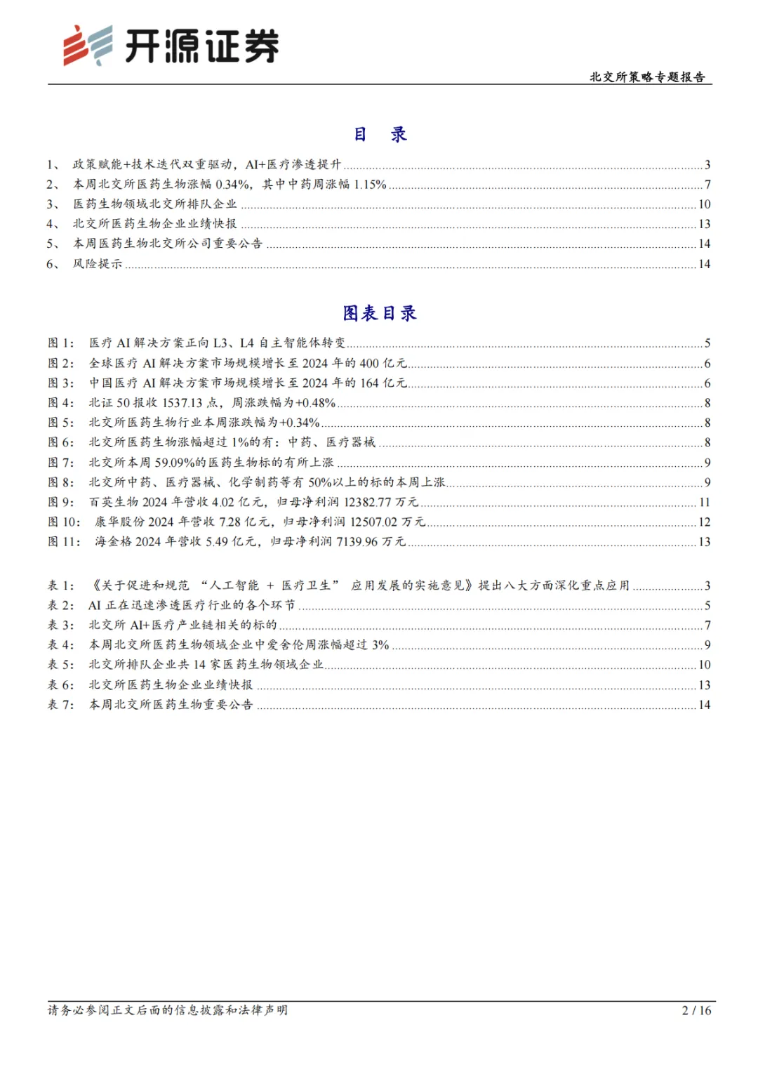 随着生成式大模型等 AI 技术的迭代,AI+医疗已全面渗透医疗产业各环节。AI医疗是依托机器学习、自然语言处理、计算机视觉等技术,深度分析复杂医疗数据,辅助临床决策、优化诊疗流程、提升医疗效率的智能化应用体系,核心价值在于提升医疗服务质量、增强可及性并降低成本。政策层面形成完善顶层设计,2025 年 10 月五部门联合发布相关实施意见,明确 2027 年建成高质量医疗数据集与专病垂直大模型、广泛应用基层诊疗智能辅助等目标,2030 年实现基层 AI辅助全覆盖、二级以上医院普遍应用 AI 影像与临床决策辅助,并确定八大应用重点方向。同年 12 月,相关专项行动将 AI 药物研发等列为重点支持领域;2026年 1 月,国家医保局将 37 项高频 AI 医疗相关辅助操作纳入全国统一价格目录,打通商业化关键环节。目前,AI 已渗透影像诊断、药物研发等多环节,通用大模型与医疗知识库的融合,推动医疗 AI 解决方案从辅助洞察向自主智能体升级。据智研咨询数据,全球医疗 AI 解决方案市场规模 2024 年达 400 亿元,预计 2025年增至 449 亿元;中国市场 2024 年达 164 亿元,预计 2025 年达 182 亿元,受益于技术进步、数据积累与政策支持,正向着更高等级自动化快速发展。北交所AI +医疗相关标的:丹娜生物、倍益康、锦好医疗、数字人、鹿得医疗、新赣江、新芝生物、辰光医疗、博迅生物。