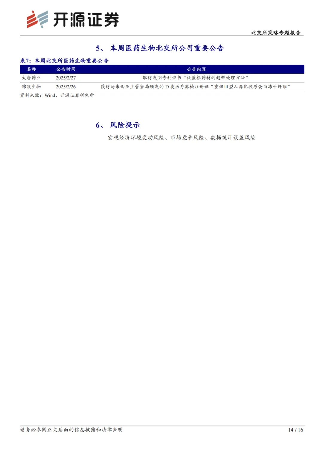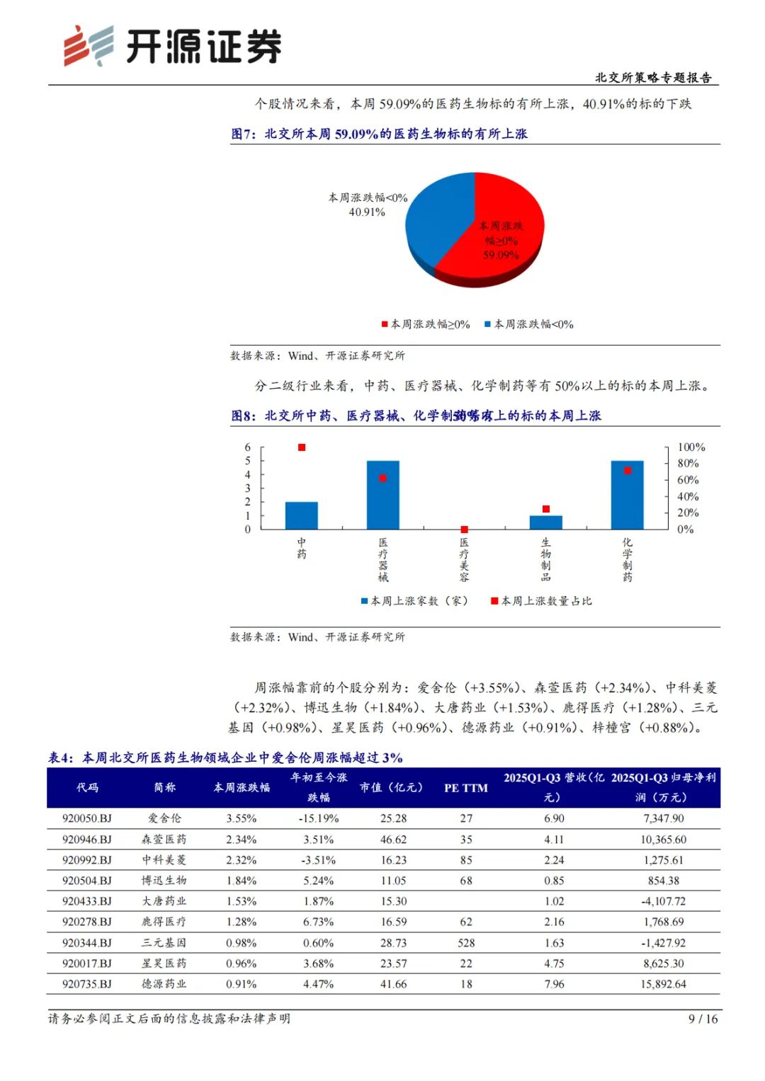 本周末北证 50 报收 1537.13 点,周涨跌幅为+0.48%。本周开源北交所五大行业均有所上涨,其中,医药生物周涨跌幅为+0.34%,涨幅最小。本周开源北交所医药生物的二级行业中,中药(+1.15%)、医疗器械(+1.09%)、化学制药(+0.51%)本周上涨;中药、医疗器械本周下跌。个股来看,本周 59.09%的医药生物标的有所上涨,40.91%的标的下跌。中药、医疗器械、化学制药等有 50%以上的标的本周上涨。周涨跌幅居前的个股分别为:爱舍伦(+3.55%)、森萱医药(+2.34%)、中科美菱(+2.32%)、博迅生物(+1.84%)、大唐药业(+1.53%)、鹿得医疗(+1.28%)、三元基因(+0.98%)、星昊医药(+0.96%)、德源药业(+0.91%)、梓橦宫(+0.88%)