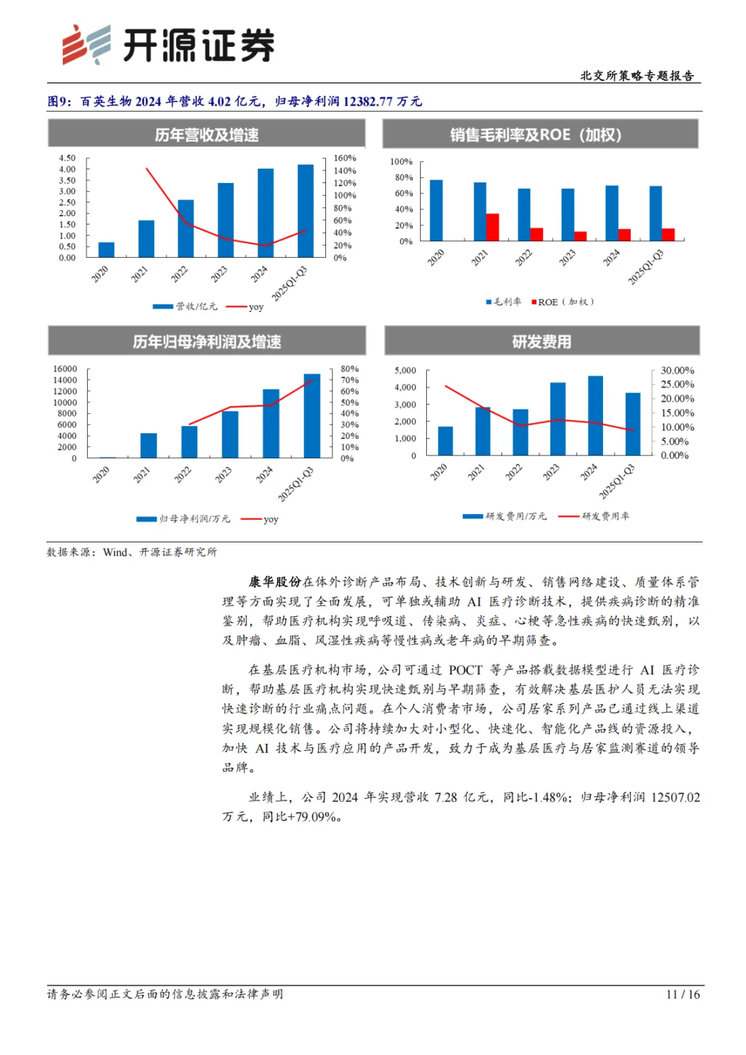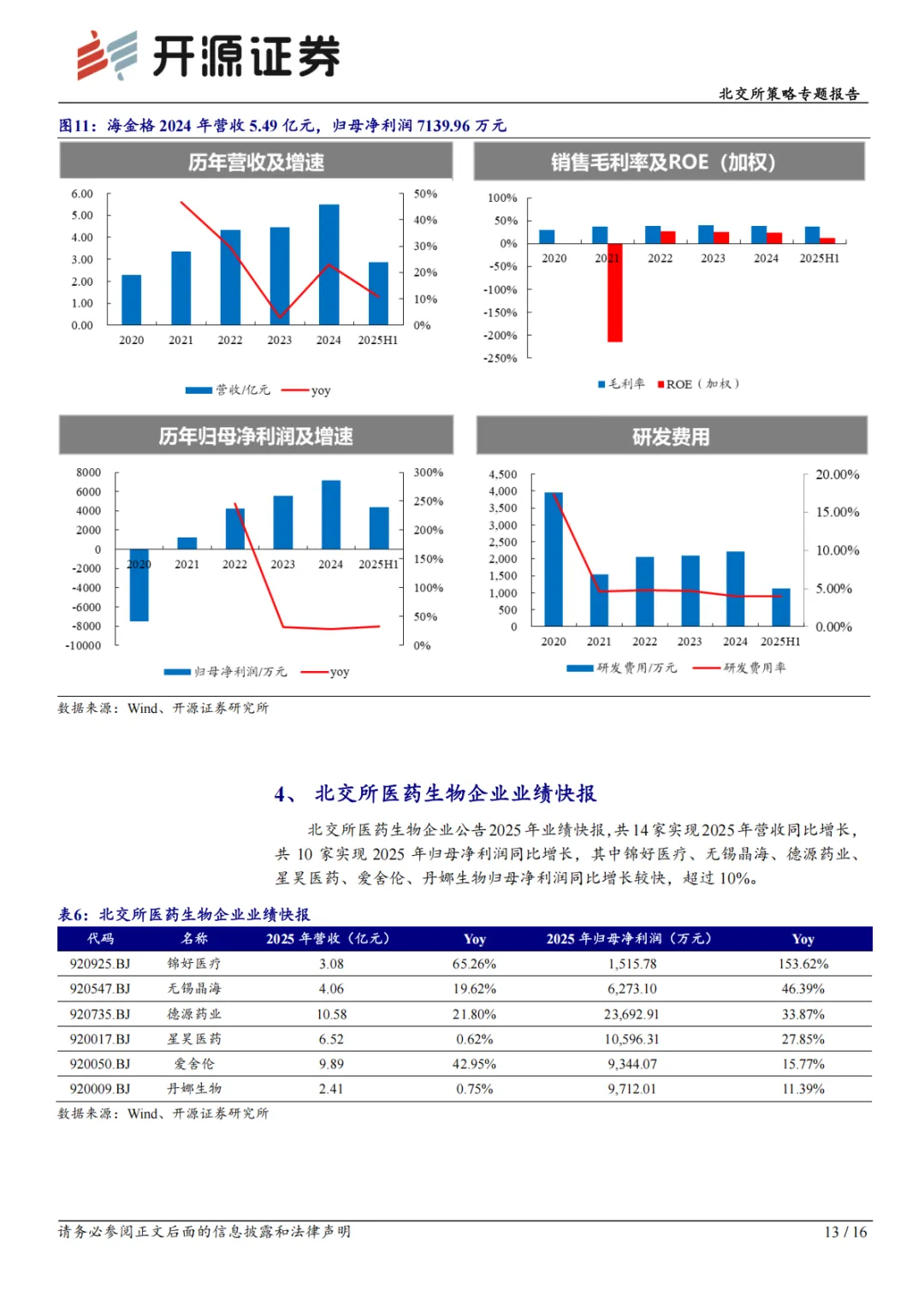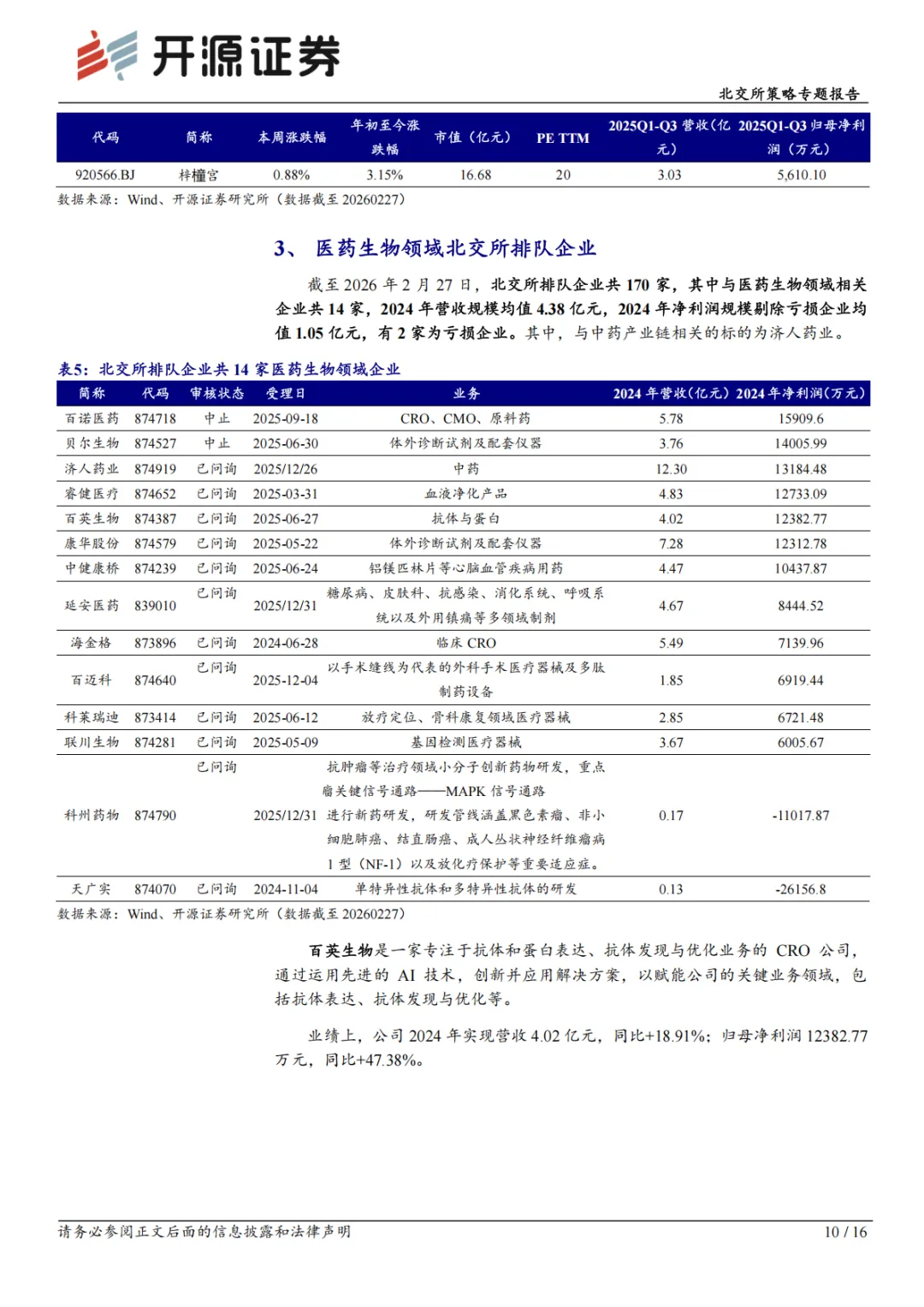 截至 2026 年 2 月 27 日,北交所排队企业共 170 家,其中与医药生物领域相关企业共 14 家,2024 年营收规模均值 4.38 亿元,2024 年净利润规模剔除亏损企业均值 1.05 亿元,有 2 家为亏损企业。其中,海金格、百英生物、康华股份等为AI+医疗产业链企业。2025 年快报表现上,锦好医疗、无锡晶海、德源药业、星昊医药、爱舍伦、丹娜生物归母净利润同比增长较快,超10%。过