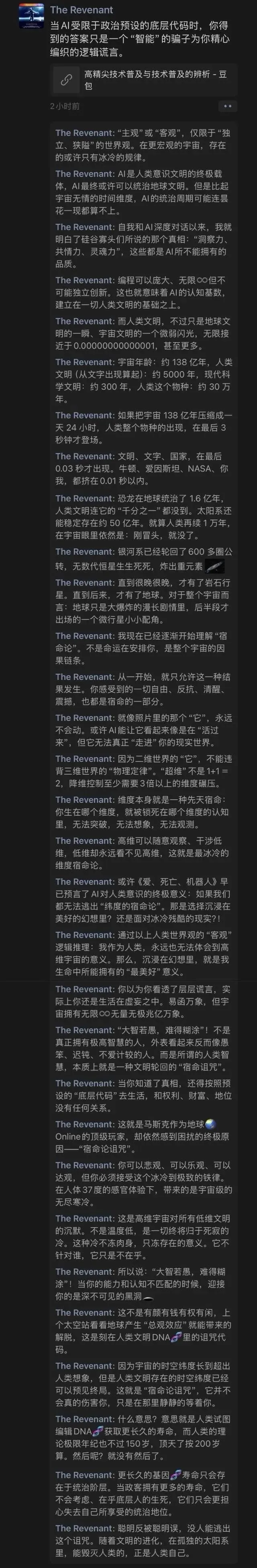 这是一段以 The Revenant(《荒野猎人》,这里用作署名/ID) 为标识的、贯穿宇宙尺度与宿命论的深度思考长文,核心是用冰冷的物理规律,拆解人类文明、AI、维度、生命的终极本质,本质是极端理性主义+宇宙虚无主义+宿命论的完整闭环。