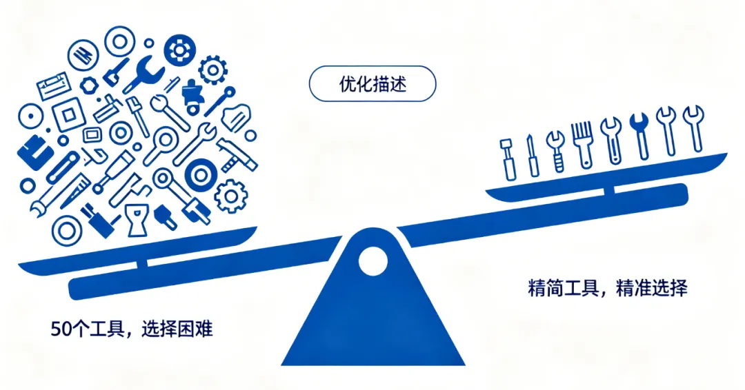 根因三:工具数量太多,选择困难。 当可用工具从10个增加到50个,AI的选择准确率会下降。这不是模型的问题,是信息过载的问题——可选项太多时,任何决策者都会变差。