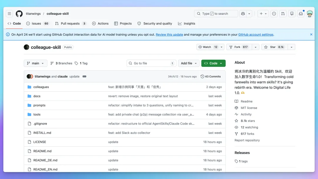 甚至有人做了一个开源项目(https://github.com/titanwings/colleague-skill),可以导入前同事的聊天记录,生成对应的 Skill。