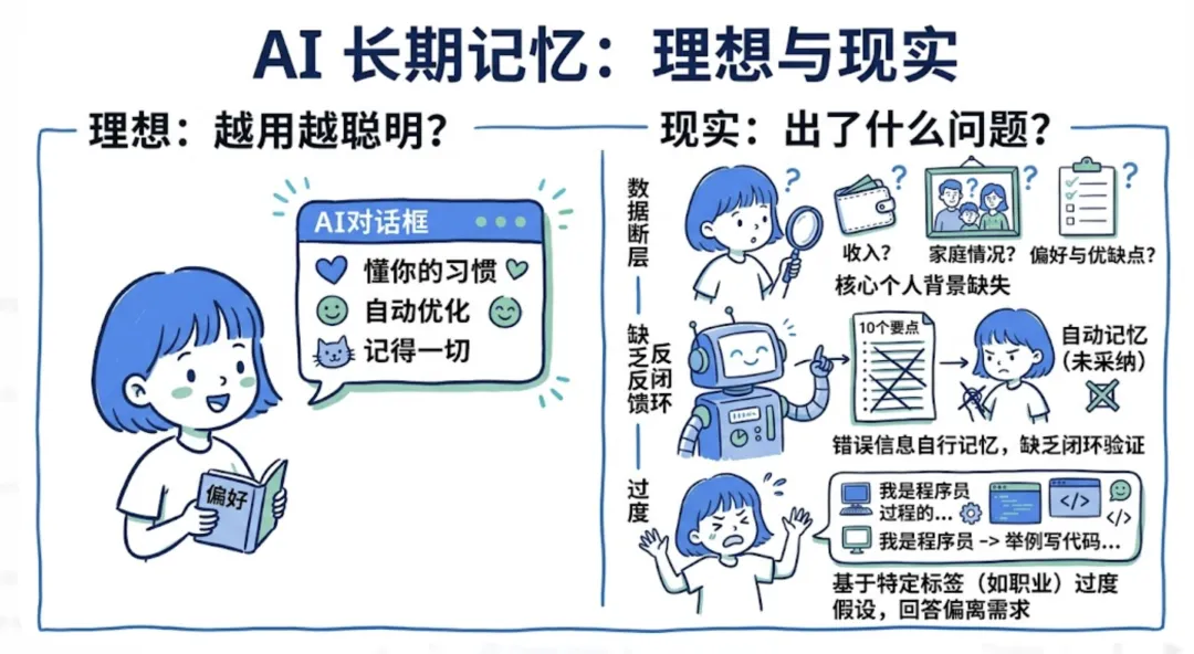 这导致所谓的长期记忆帮助不大,甚至会过度拟合某些信息——比如你是程序员,它总爱用写代码举例,反而偏离你的真实需求。