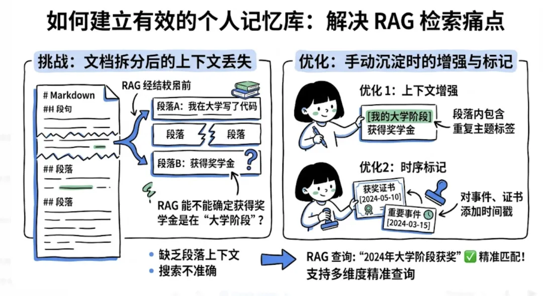 比如”我的大学阶段”可能包括十几个段落,当你问”我大学阶段有什么经历”时,它可能只匹配到第一个段落。
