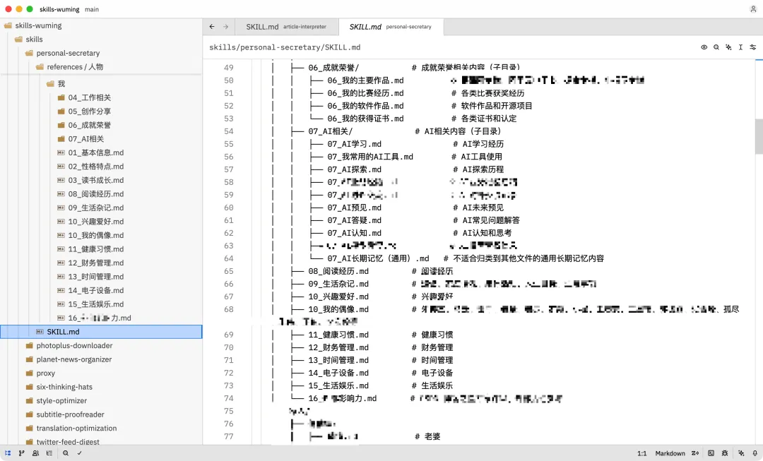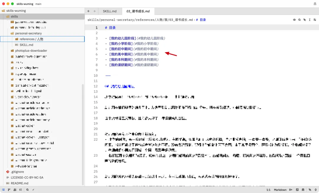 有了之前的个人资料,我让 AI 根据目录结构拆分成多个独立的 Markdown 文件。