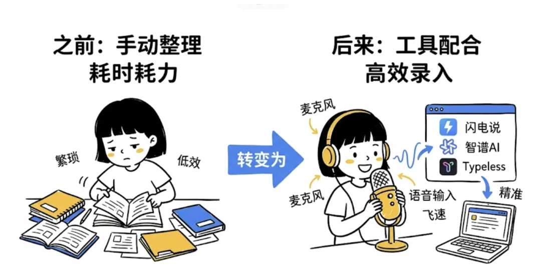 后来我开始使用一些工具:闪电说、智谱 AI 语音输入法,最近改用 Typeless,配合麦克风,可以更高效地录入信息。