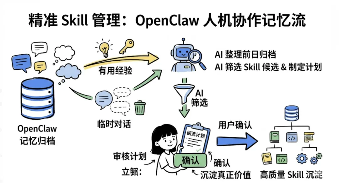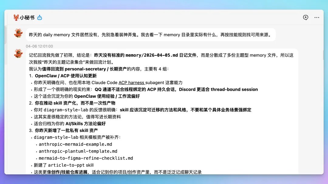 因此,我在 OpenClaw 中启动定时任务,每天整理前一天的内容,筛选出适合回流到 Skill 的部分,让它出个计划,确认后再回流进去。