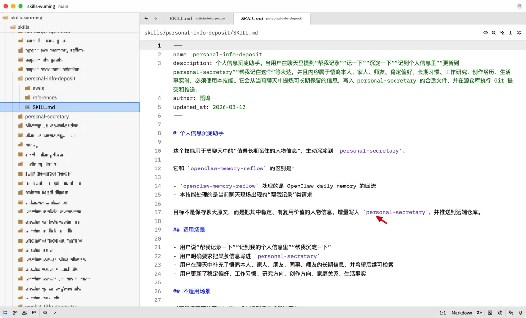 有了 OpenClaw 之后,有时都不愿意主动打开个人信息 Skill 来修改,不太方便。