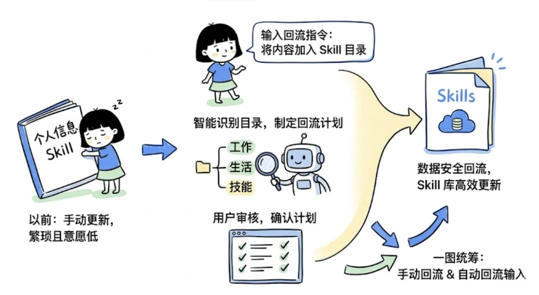 因此我又做了一个回流的 Skill,当我提到要回流个人信息时,它会自动识别我的目录,然后给出计划。