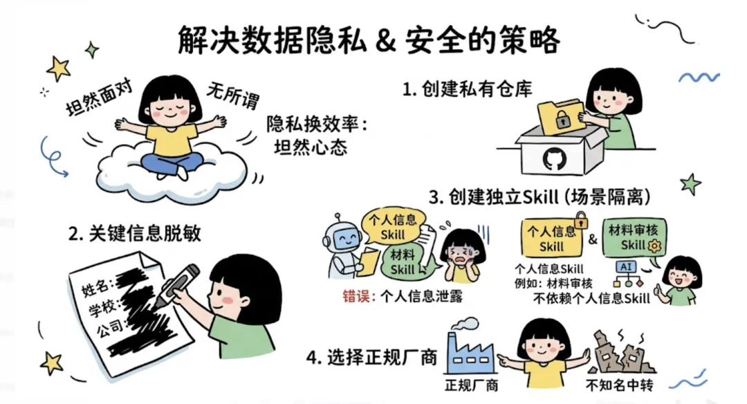 创建私有仓库,避免主动公开 对姓名、学校或公司等关键信息做脱敏处理 特别隐私的数据不要写进去