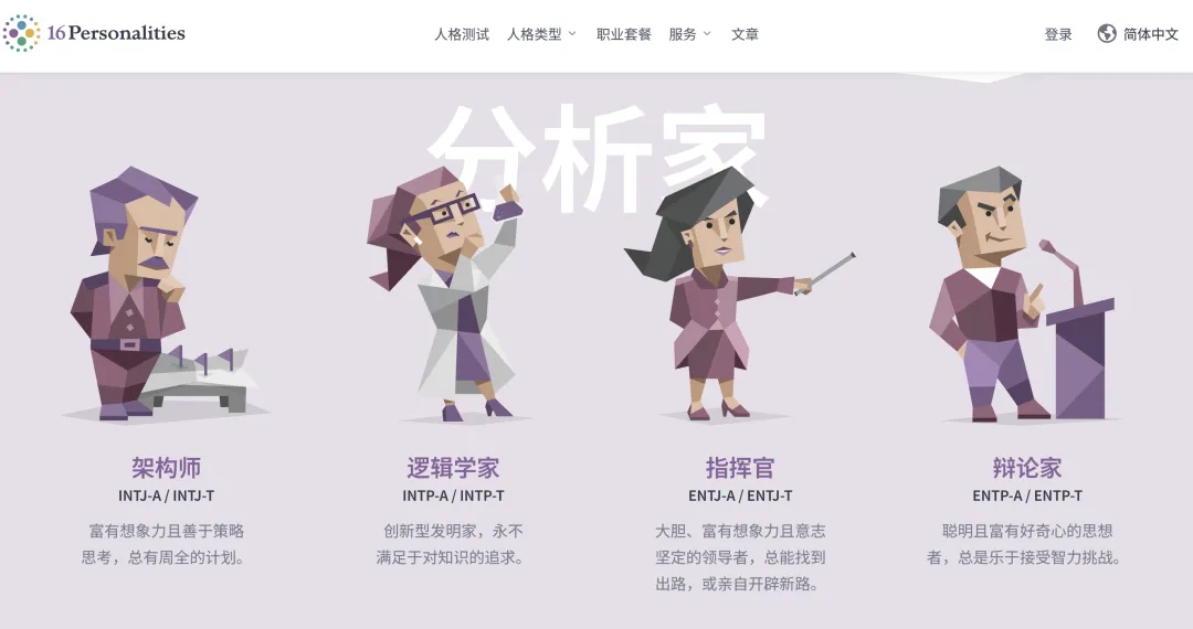 参见:https://www.16personalities.com/ch/%E7%B1%BB%E5%9E%8B%E6%8F%8F%E8%BF%B0
