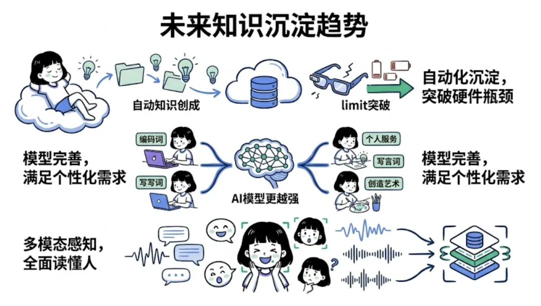我认为未来知识的沉淀会走向自动化,能够突破 AI 眼镜这种便携性或者是电池的限制。