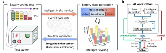 a集成平台示意图。基于每3个周期的实时循环数据,实现了一个经过训练的状态感知模块,作为一个智能的现场监测器,用于识别运行电池的状态,包括稳定、过渡和衰减状态。强化学习(RL)通过基于电池状态自适应地优化固态电池在循环中的快速充电策略,进一步实现了智能循环。电化学测试站用于循环由上述AI工作站控制的实际电池。b面向工程的工作流程,显示实时通信、数据和控制回路。AI工作站支持与测试仪硬件的双向通信。每3个周期的数据都会被连续收集以评估电池状态,然后用于自适应地控制下一段的充电策略。这项工作的目标是证明智能自行车能有效延长寿命。