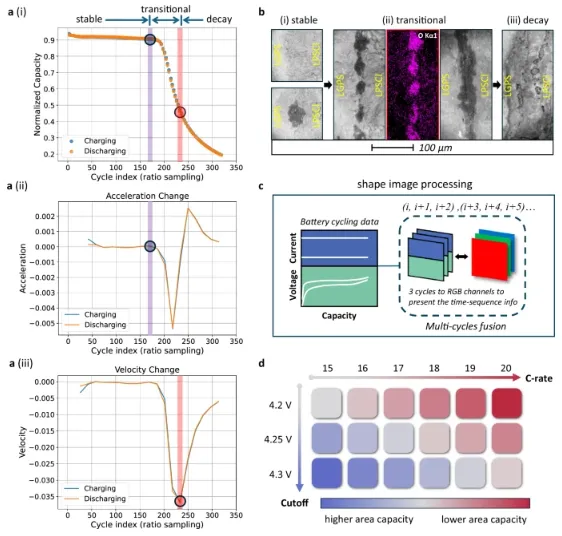 a数据集中具有循环演变的三种电池状态的定义。(i)在容量保持试验中,电池在循环过程中分为稳定、过渡和衰减状态;(ii)根据容量二阶导数的加速度曲线划分稳定和过渡状态的紫色节点随着循环而变化;(iii)红色节点,根据容量变化曲线的一阶导数的速度曲线划分过渡状态和衰减状态。b分离器中两种固体电解质界面处不同电池状态的代表性背散射扫描电镜(SEM)横截面图像,状态ii)也显示了氧气(紫色)的相应能量色散X射线光谱(EDS)图。c形状成像方法的处理工作流程。这种方法将每3个周期的数据集成到ResNet模型的图像的自然RGB通道中。d基于各种C费率(1C)的一系列策略的充电操作 = 150 mA/g)和截止值,从而影响面积容量。