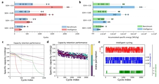 a达到95%、90%、85%、80%四种不同健康状态(SOH)所需的循环次数。颜色条的长度表示平均值,误差条表示多个电池的标准偏差(SD)。数据以平均值表示 ± SD。对于情报,n = 4 独立样品,每个电池单独制备和测试。基准电池是指没有智能循环的恒流测试,包括n个 = 7 独立样本。b基于与(a)中的电池对应的不同SOH水平的活性材料的累积比能。c 7次基准测试的膝盖点容量曲线,均显示SOH加速下降。d智能自行车的代表性容量曲线。不同的充电动作导致循环时容量分布分散,红色拟合曲线与基准进行比较。颜色条表示电池状态的实时感知,0、1和2分别表示稳定、过渡和衰减状态。e智能循环期间C速率和截止值的变化以及监测到的电池状态。