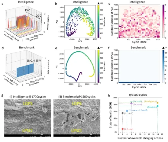 a在智能自行车中的自适应充电动作下,针对18种自行车策略中的每一种绘制了自行车期间电池状态的变化。所有18个充电动作的索引从0到17,C速率从15增加 C至20 C in 1 C每三个索引递增一次。在每组3个连续动作指标中,截止电压增加4.2 V, 4.25 V、 4.3 V.b具有智能循环的第一主成分(PC1)和第二主成分(PC2)的分布和运动趋势,其中主成分分析(PCA)基于形状图像的电压部分。c PCA空间中任意两个相邻步骤之间的欧几里德距离,由智能循环的所有主成分计算得出。颜色条表示在相应循环范围内计算的欧几里德距离值的数量。d–f(a–c)的相应基准结果。该基准的充电动作固定为18 C和4.25 V.g智能循环和基准测试的二次电子SEM图像与1700次循环后智能循环和1500次循环后基准测试的样品的比较。h可用充电动作对电池寿命的影响。比较了考虑不同C速率和截止组合量的各种预编程固定策略,说明了充电次数从2到18变化时对第1500次循环电池SOH的影响。