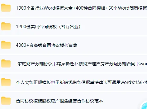 1000个各行业Word模板大全+400种合同模板+50个Word简历模板链接:https://pan.baidu.com/s/1S1hcWxcMIPMFW4AqEB5HXg提取码:4njn
