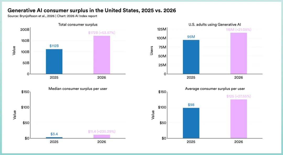 【摘要】 斯坦福大学以人为本人工智能研究院(HAI)于2026年4月发布《2026年AI指数报告》经济篇,以海量真实数据呈现了AI对就业、投资、消费者价值、企业采纳和生产力的全面影响。报告的核心结论,并不是一句简单的"AI在抢饭碗",而是更复杂、更分层的现实: 最年轻的一批求职者,正在成为这场技术变革最早的代价承担者 这不是一个"未来会发生"的故事,它正在发生,而且已经有数据为证。 第一个真相:AI不是在裁员,它在悄悄锁死年轻人进门的通道 大多数关于AI失业的讨论,都聚焦在"裁员"二字上。这是一个直觉上很容易理解的叙事:AI变强了,公司裁掉一批员工,换成AI。 但斯坦福这份报告揭示的,是一个更隐蔽、也更令人不安的机制。 达拉斯联邦储备银行对ADP数百万工人薪资数据的深度分析显示: 22至25岁软件开发者的就业人数,自2024年以来已下降近20% 。而这一下降,并非来自大规模裁员——而是 新招聘数量的锐减 。越来越多的企业,正在减少对入门级软件工程师的招募,因为AI已经能够承担相当比例的基础编码工作。 与此同时,31岁以上的工程师几乎未受影响,就业基本稳定甚至略有增长。 这一对比揭示的规律极其清晰: AI并不需要向现有员工宣战,它只需要在门口悄悄站岗,让新人进不来。 这对整个社会的含义是深远的。裁员是可见的,会上新闻,会引发反弹,会触发监管。但"不招人"是无声的,不会有人游行,不会有媒体聚焦。它以一种极其温和的方式,悄然改变了一代人的职业起点。 那些今年刚毕业的计算机系学生,他们面对的就业市场,已经和2022年截然不同。他们可能永远无法体会"初级工程师"这个职业阶段,因为那个阶段——正在被AI替代。 第二个真相:美国砸了2859亿美元搞AI,但普通美国人用AI的比例全球排第24 这是整份报告里最反直觉、也最少被媒体提及的数据之一。 2025年,美国在AI私人领域的投资额达到了惊人的 2859亿美元 ,是中国投入的23倍,是英国的约百倍,在全球AI投资版图中占据压倒性地位。从资本视角看,美国毫无疑问是AI时代的绝对霸主。 但报告同时揭示:从普通消费者的实际使用渗透率来看—— 投资最多的国家,民众实际用AI的比例,远低于众多新兴市场国家。 这背后的逻辑并不难理解:美国的AI投资,主要流向了少数头部科技公司、数据中心、芯片、基础模型,是一场发生在精英层和资本层之间的游戏。而在印度、东南亚、中东,AI工具已经真实地渗透进普通人的日常工作——翻译、客服、内容创作、教育——因为他们没有更多选择,AI就是升维的捷径。 美国投的是AI的"未来",新兴市场用的是AI的"当下"。两者之间,是一道意想不到的数字鸿沟。 对投资者而言,这意味着什么?新兴市场的AI应用层投资,可能比硅谷的基础模型竞赛更具确定性,更贴近真实需求。 第三个真相:AI真实创造了1720亿美元的社会价值,但没有人为它付钱 这是报告中最具学术创新价值的章节,也是几乎所有报道都忽略的内容。 斯坦福经济学家Brynjolfsson团队首次对"生成式AI的消费者剩余"进行了系统性纵向测算。他们的方法来自经济学经典工具—— 意愿支付调查(Willingness to Accept) :询问用户,"你愿意接受多少钱的补偿,来换取放弃使用生成式AI整整一个月?" 2025年初:美国生成式AI消费者剩余总量约为1120亿美元 每位用户的中位价值:从3.4美元暴涨至11.4美元,增幅高达235% 消费者剩余,是经济学中衡量"用户获得但未支付的真实价值"的指标。这1720亿美元,代表的是美国普通人从ChatGPT、Claude、Gemini等工具中真实获得的生活质量与效率提升——但他们几乎没有为此付出对等的费用(大多数用免费版或每月20美元的订阅)。 这印证了诺贝尔经济学奖得主William Nordhaus的经典研究结论: 历史上重大技术创新的发明者,平均只能捕获约3%的社会总收益 。蒸汽机、电力、互联网,概莫能外。AI正在重演这一历史规律——普通人几乎免费享用着价值1720亿美元的工具,而资本市场追逐的,不过是那不足3%的商业变现份额。 对创业者和投资人而言,这是个巨大的信号: AI真实创造的价值,远大于今天已被商业化的部分 。那些能把"消费者剩余"转化为"商业收入"的商业模式,才是下一个十年最值钱的创新。 第四个真相:专家和公众之间,隔着一道50个百分点的认知鸿沟 这50个百分点的差距,不是普通的信息差,而是一道 系统性的认知断层 。 第一,AI的真实影响是渐进式的、非戏剧化的,而恐慌叙事更容易病毒传播。每一篇"AI将取代XX职业"的标题,都比"AI让工人效率提升26%"的研究更容易获得点击。媒体生态天然放大恐惧,压缩希望。 第二,普通公众缺乏直接接触AI系统的机会与能力,他们对AI的认知,很大程度上来自媒体报道和社交网络——而这两者,都倾向于呈现极端化叙事。 第三,也是最重要的一点: 感知危机本身会制造真实的社会后果 。当64%的公众相信AI将减少工作岗位,大量年轻人就会在选择专业、规划职业时做出扭曲的决策——要么恐慌性地追逐AI技能,要么干脆放弃技术领域。两种极端都会产生社会成本。 AI专家不一定是对的,公众也不一定是错的。但这道鸿沟本身,已经是一个需要被认真对待的社会问题。 第五个真相:Agent AI需求暴增280%,但真正在用的企业少得可怜 AI技能现在出现在 2.5% 的美国职位招聘中,招聘信息中提及"智能体AI(Agentic AI)" 能力的频率,同比增长超过 280%,280%,这不是一