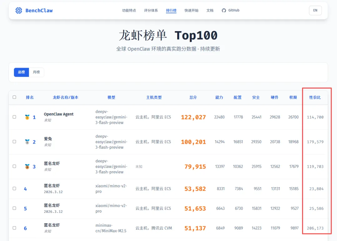 🏆 BenchClaw 综合得分:79,915 分🧠 能力: 280/500 (93%) ████████░░⚡ 性能: 450/500 (90%) ████████░░💰 成本: 400/500 (80%) ████████░░⚙️ 配置: 380/500 (76%) ███████░░░🔐 安全: 490/500 (98%) █████████░榜单排名:#42 / 1,234 次提交除了分数,BenchClaw 还有一个三维诊断,帮你找瓶颈。