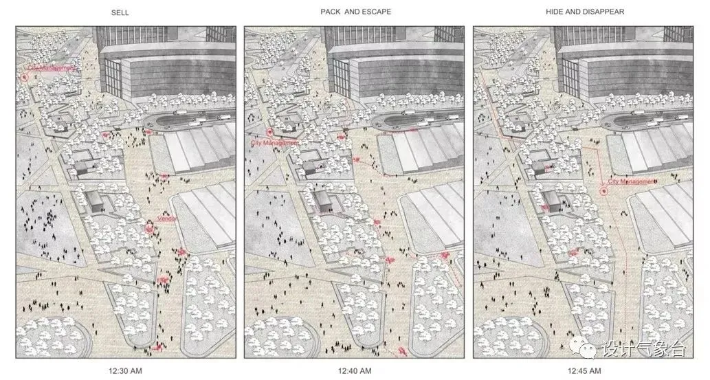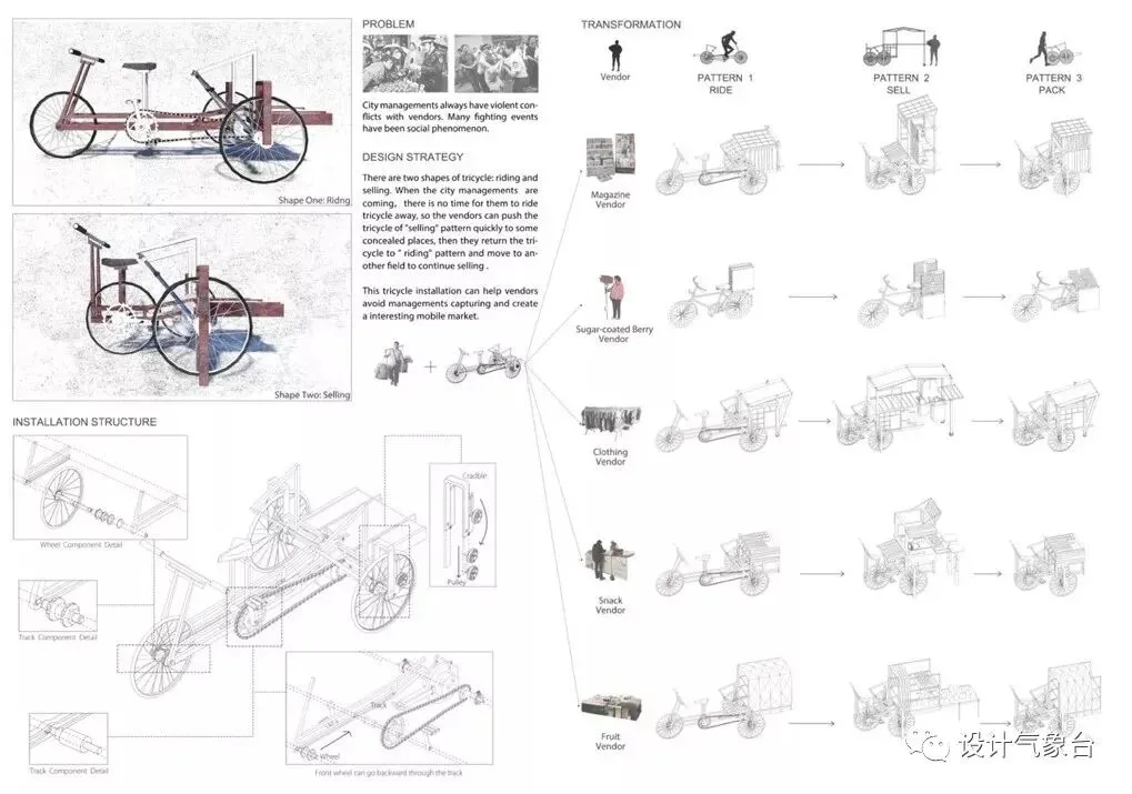 这样的设计足够自下而上,足够接地气。学生们也通过跟踪一个辛苦卖冰糖葫芦的阿姨,为阿姨设计了一个多场景下可以使用的餐车和躲避城管的三条“逃跑路线”。